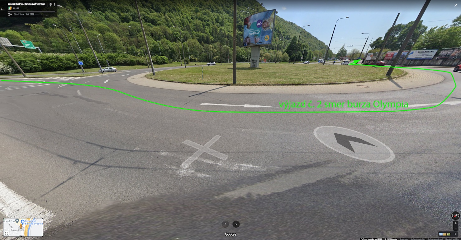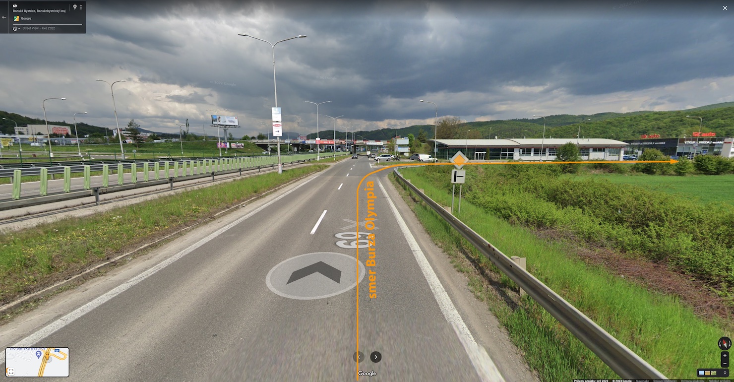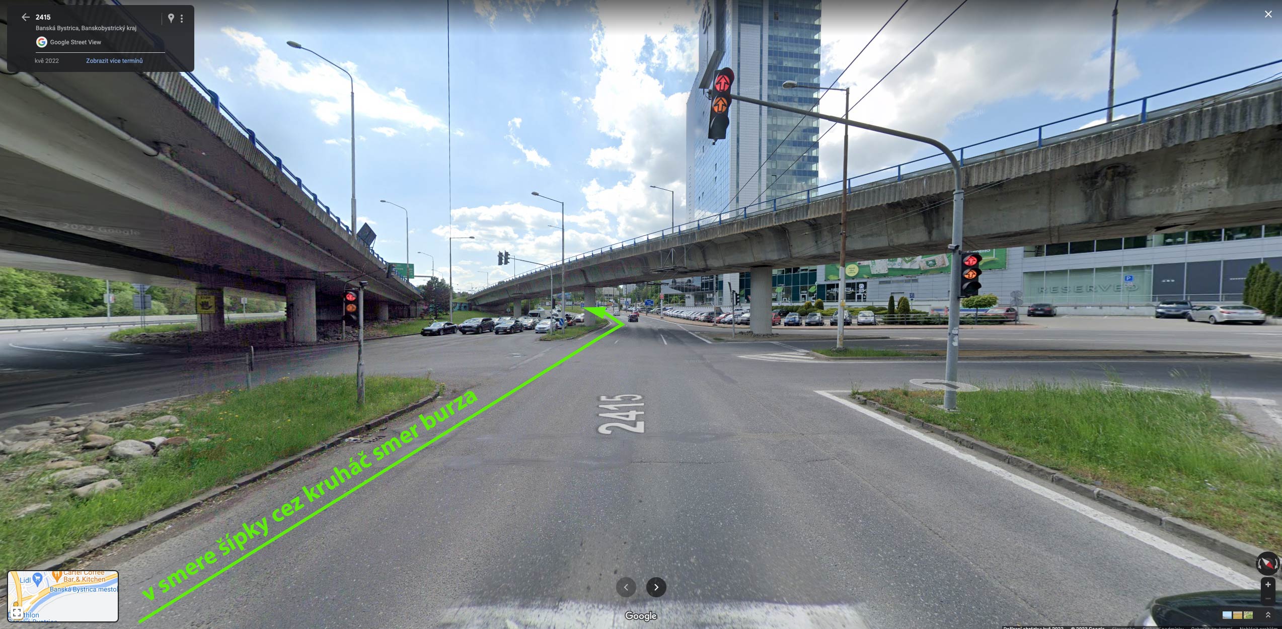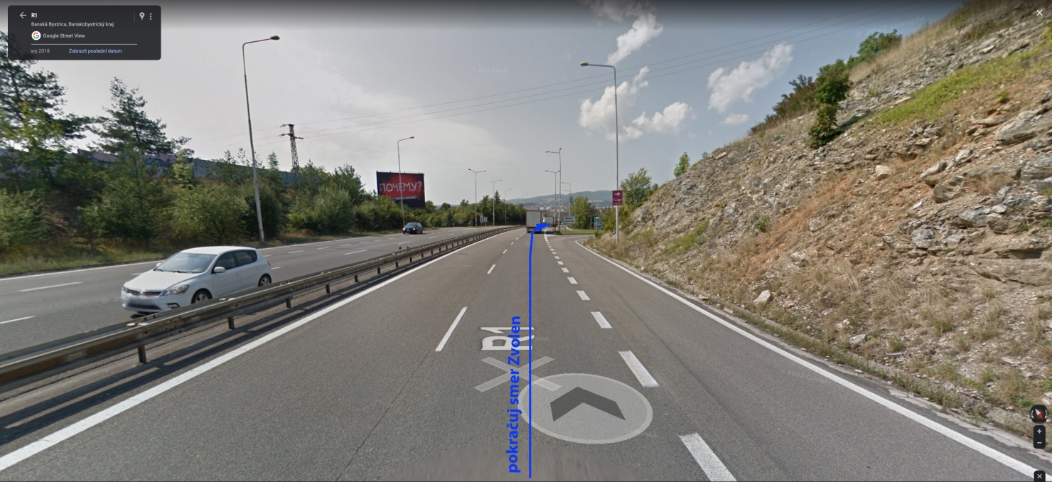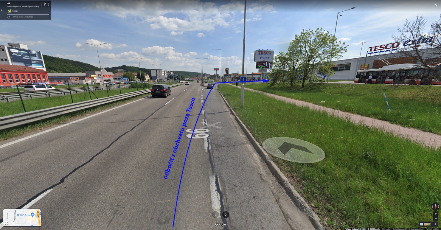 Tu zídeš z obchvatu BB a odbočíš do prava. Po odbočení pokračuješ rovno popri Slovnaft vľavo a Tescu vpravo. Pôjdeš miernym kopčekom na koniec križovatky. Toto je odbočka č. 2, navigácia ťa bude pravdepodobne posielať z obchvatu dole skôr. Na prvej odbočke neodbočíš!