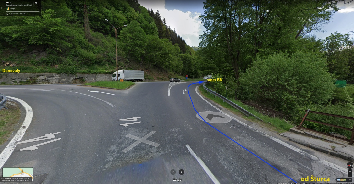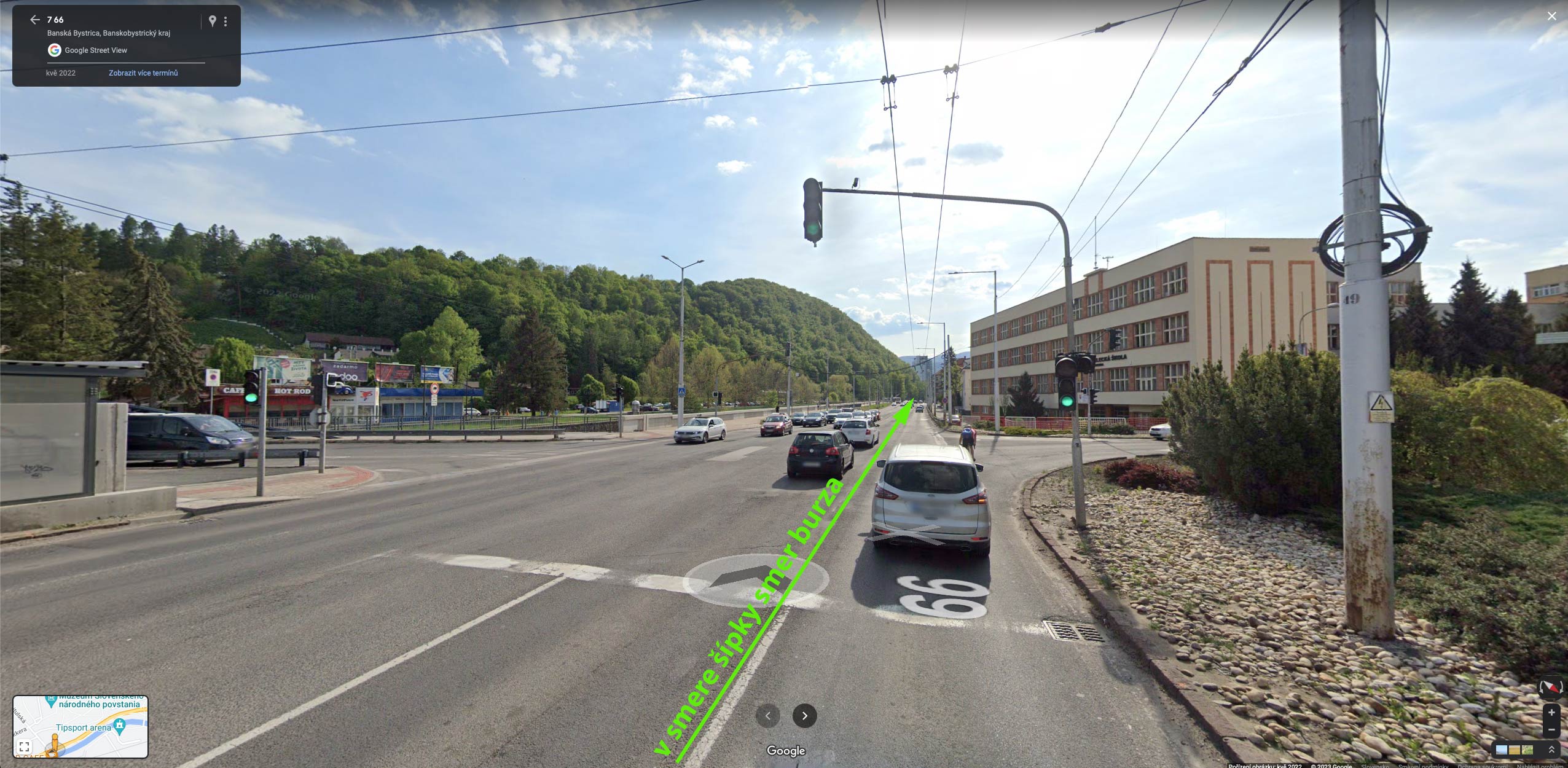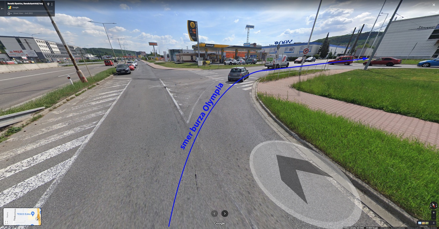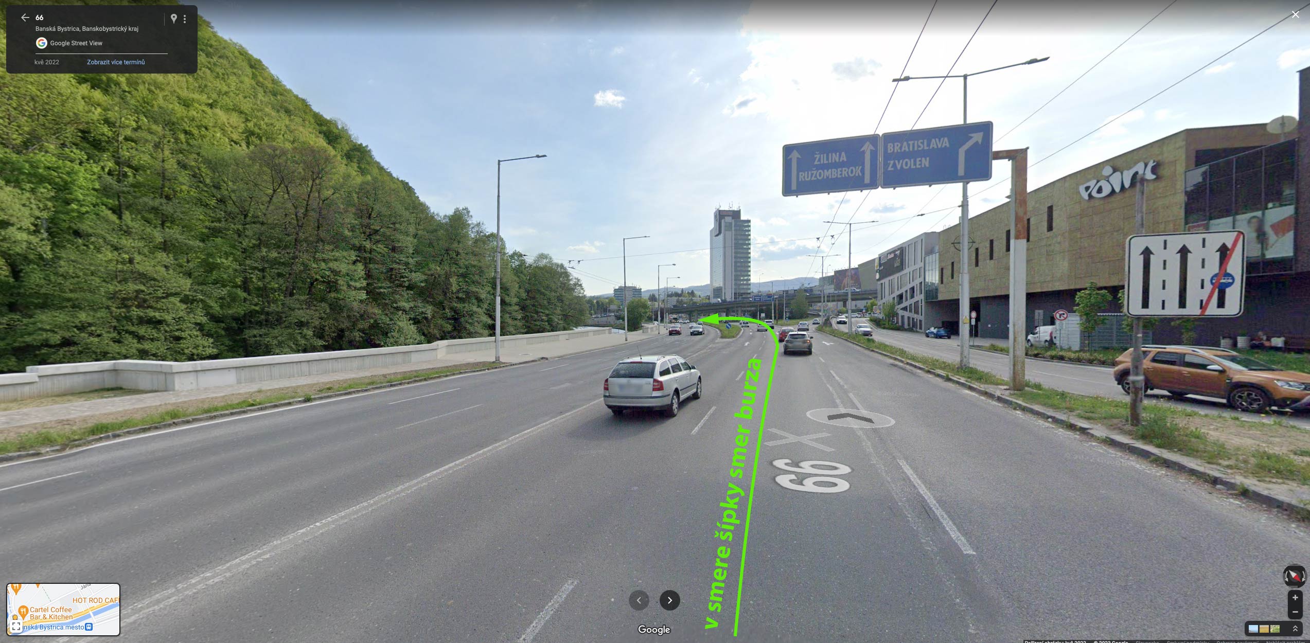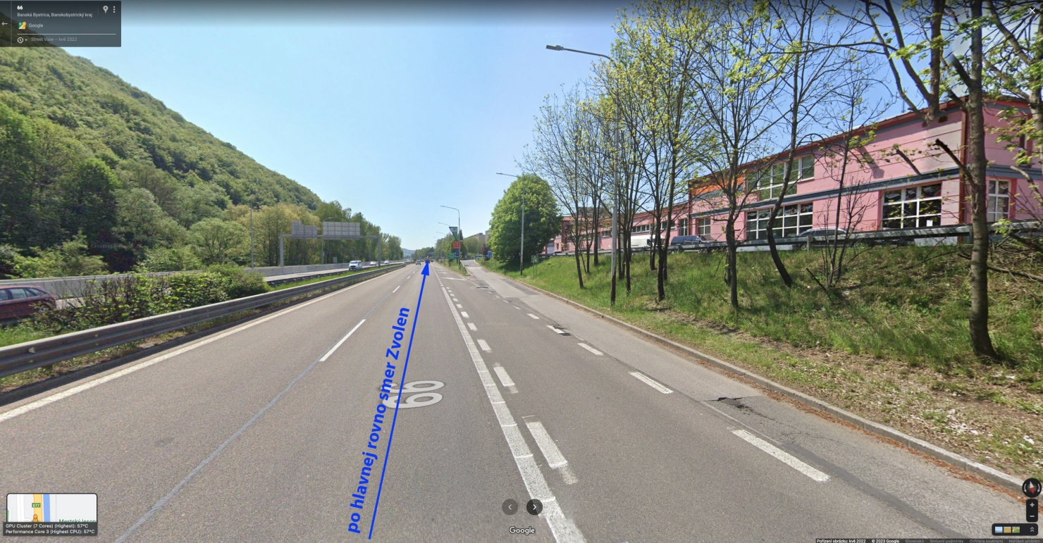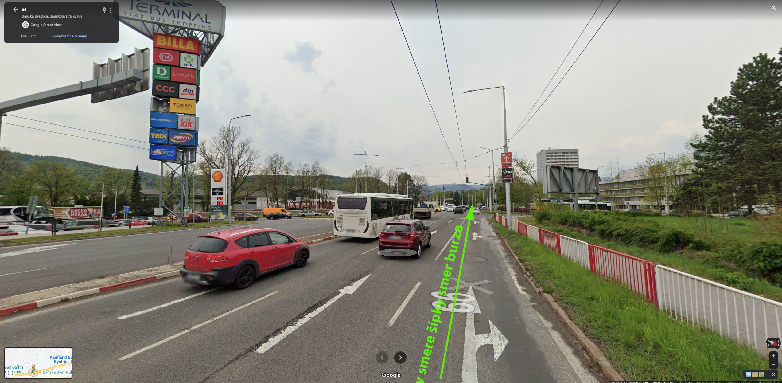 Tu zídeš z obchvatu BB a odbočíš do prava. Po odbočení pokračuješ rovno popri Slovnaft vľavo a Tescu vpravo. Pôjdeš miernym kopčekom na koniec križovatky. Toto je odbočka č. 2, navigácia ťa bude pravdepodobne posielať z obchvatu dole skôr. Na prvej odbočke neodbočíš!