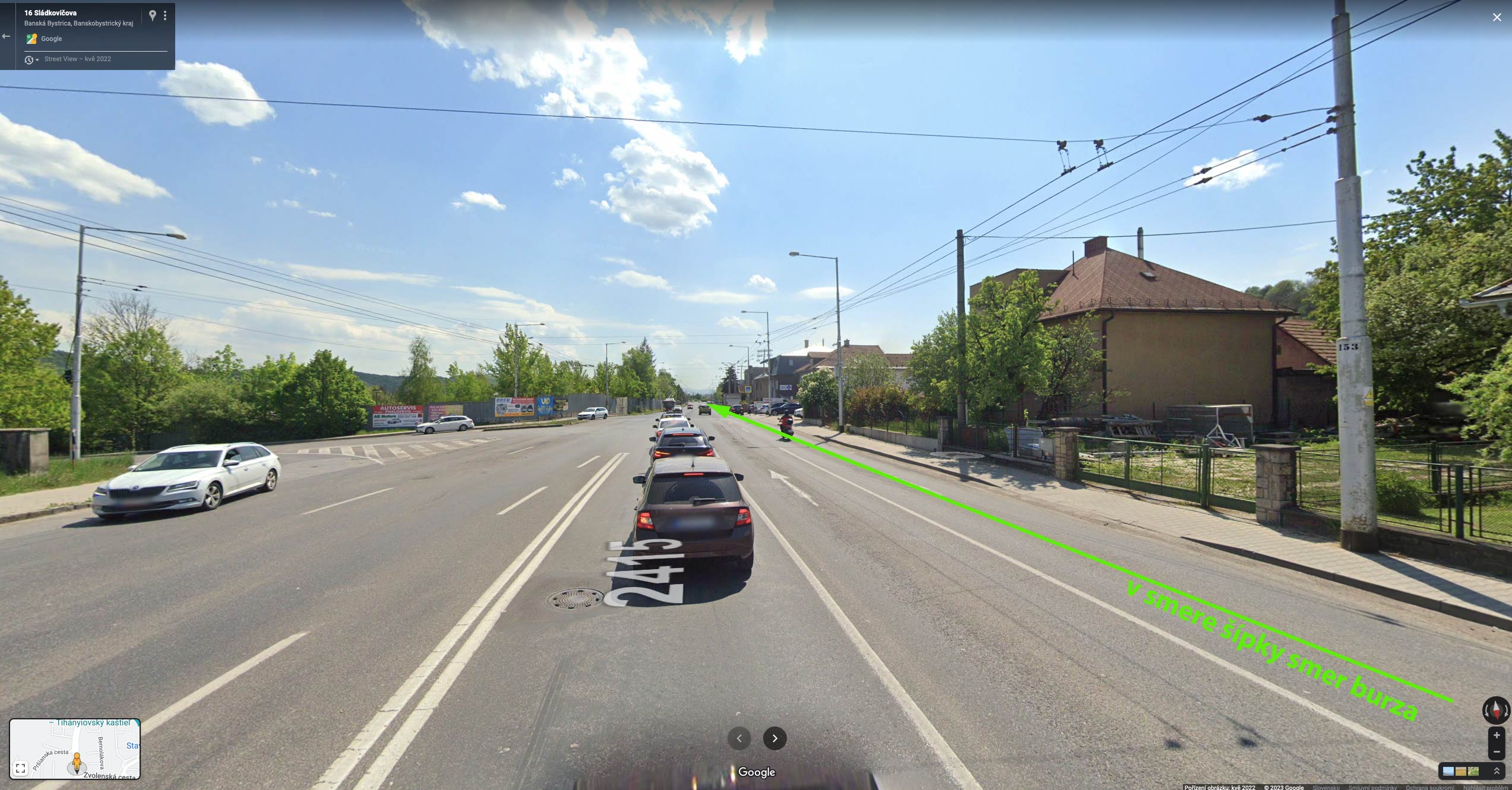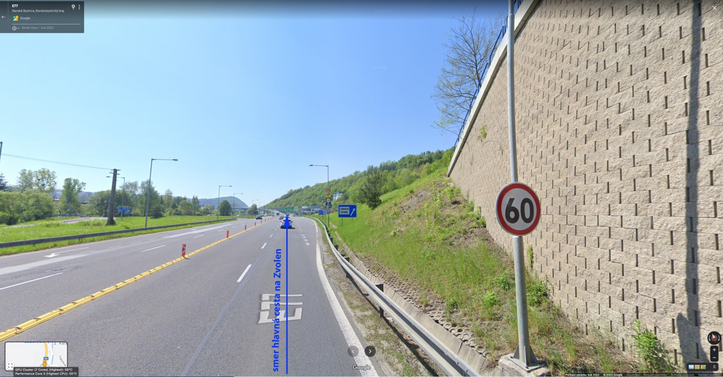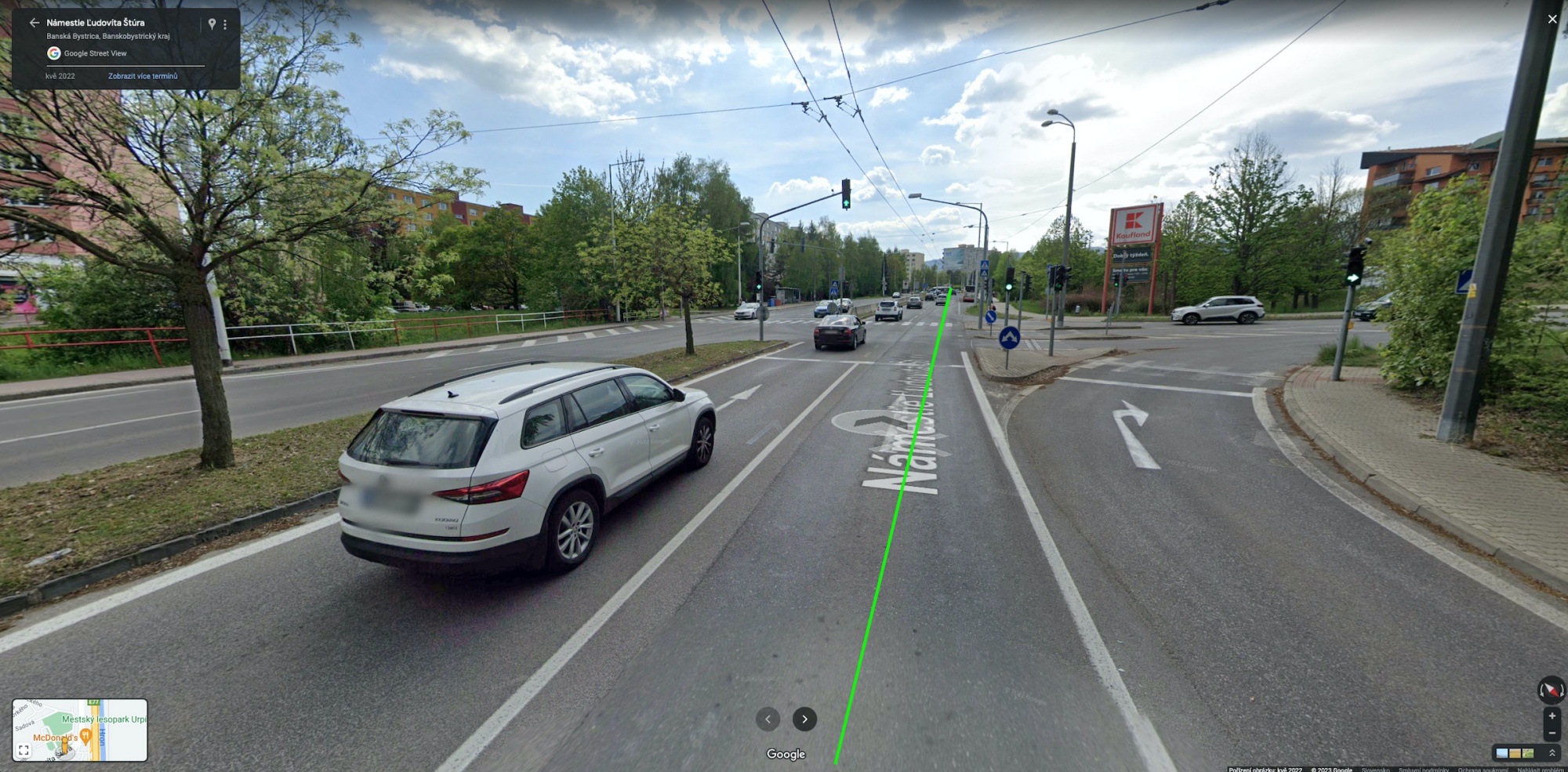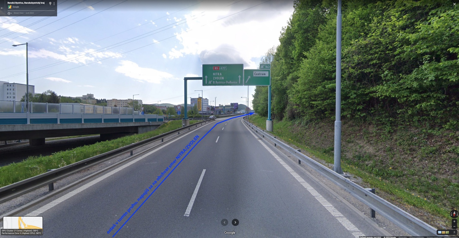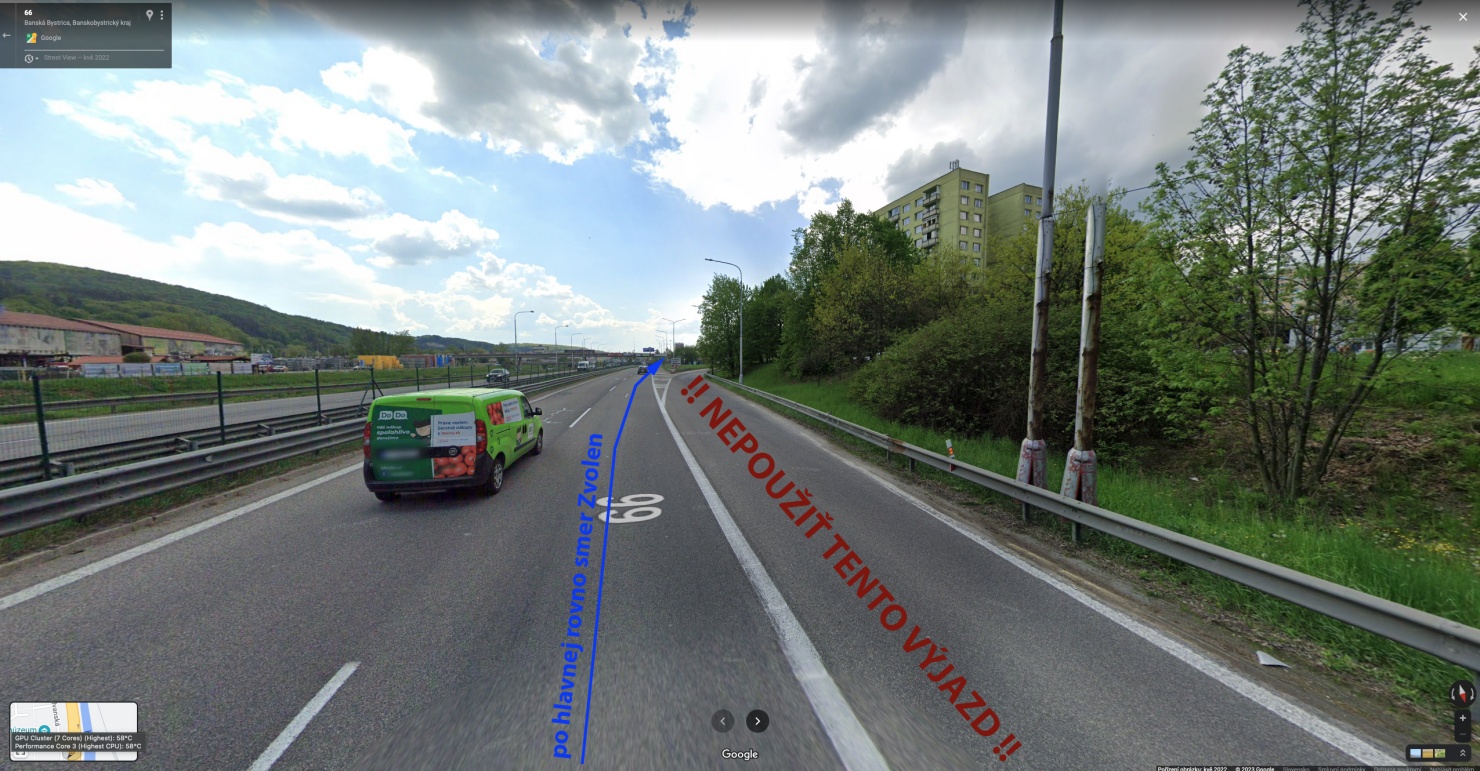 Tu zídeš z obchvatu BB a odbočíš do prava. Po odbočení pokračuješ rovno popri Slovnaft vľavo a Tescu vpravo. Pôjdeš miernym kopčekom na koniec križovatky. Toto je odbočka č. 2, navigácia ťa bude pravdepodobne posielať z obchvatu dole skôr. Na prvej odbočke neodbočíš!