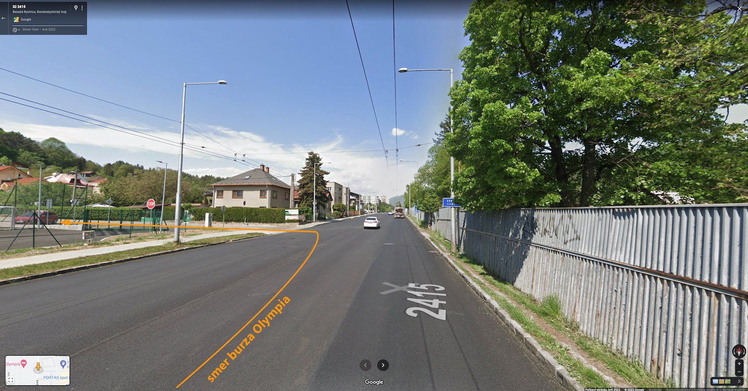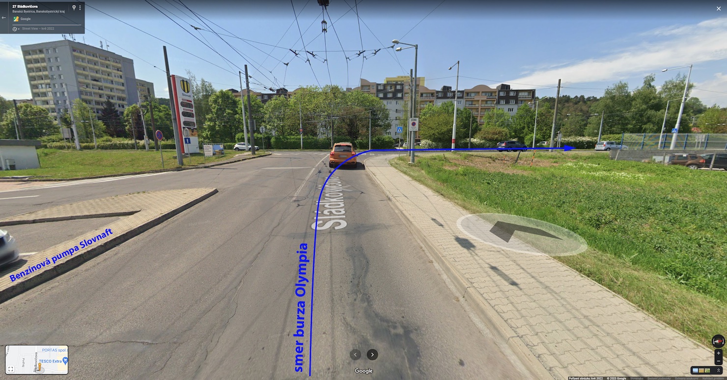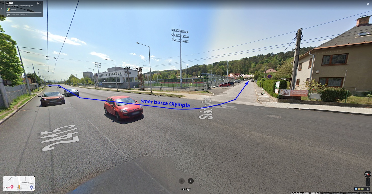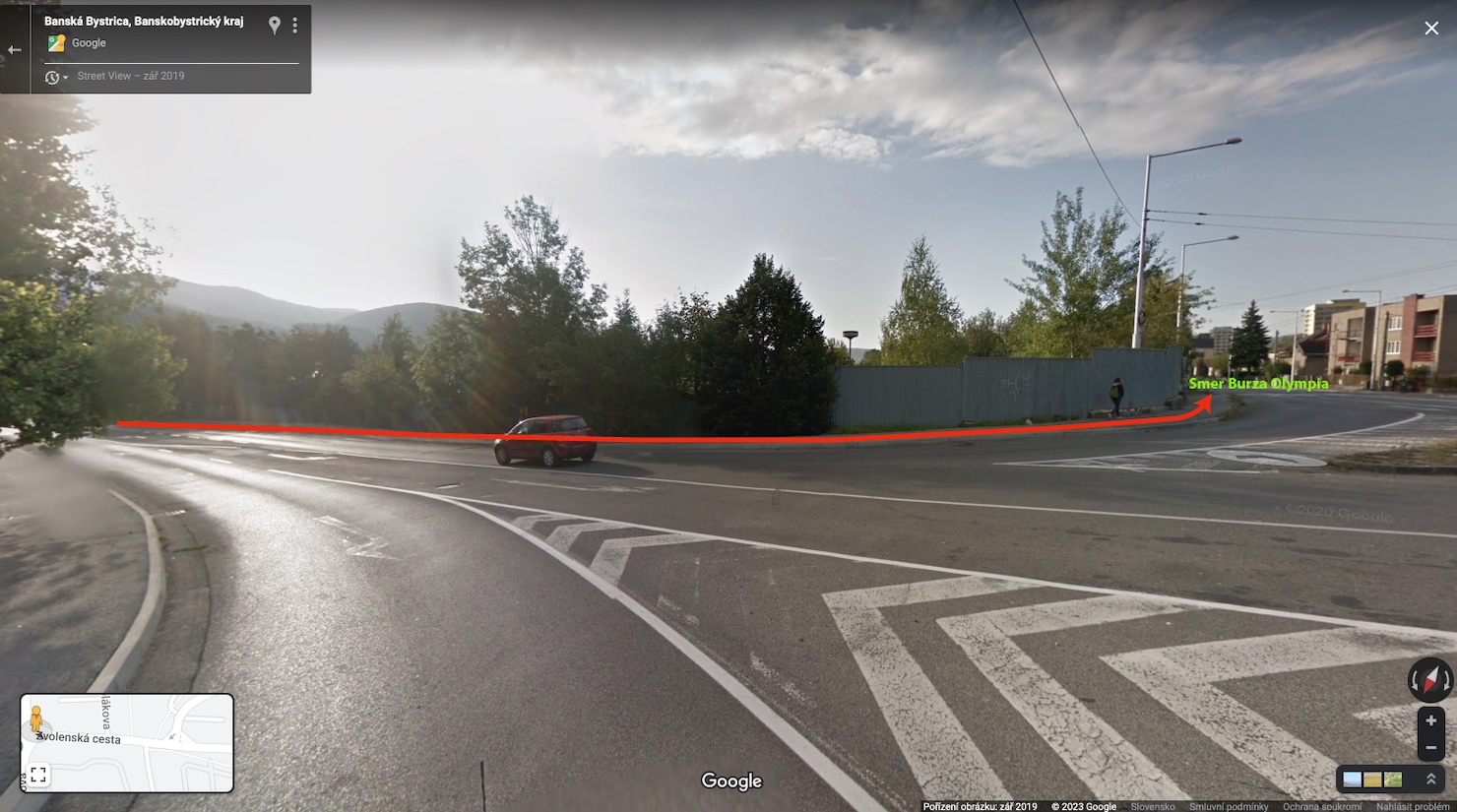 Pokračuj približne 1,5 km rovno po hlavnej a pri Slovnaft pumpe sa preraď do ľavého pruhu. Na konci furbalového štadiónu odboč vľavo a pokračuj rovno k penziónu Olympia.