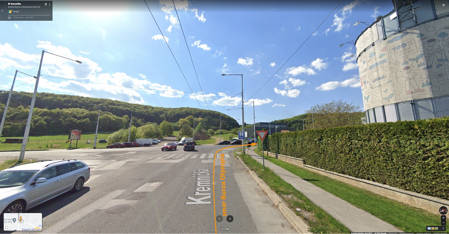 Tu zídeš z obchvatu BB a odbočíš vpravo. Po odbočení pokračuješ rovno popri Slovnaft vľavo a Tescu vpravo. Pôjdeš miernym kopčekom na koniec križovatky. Toto je odbočka č. 2, navigácia ťa bude pravdepodobne posielať z obchvatu dole skôr. Na prvej odbočke neodbočíš!