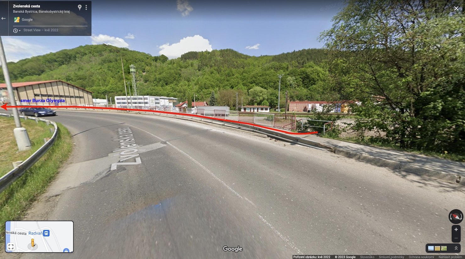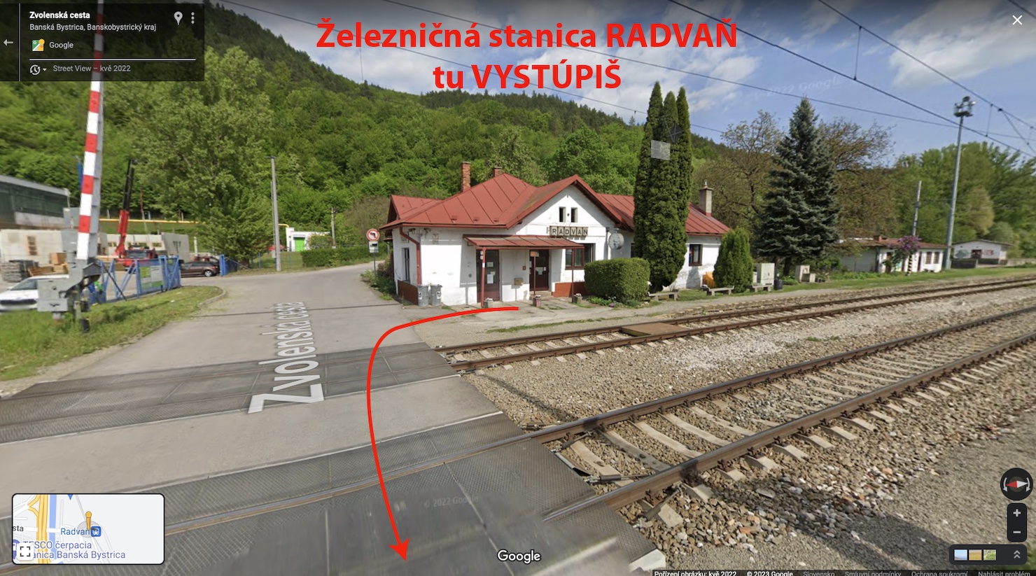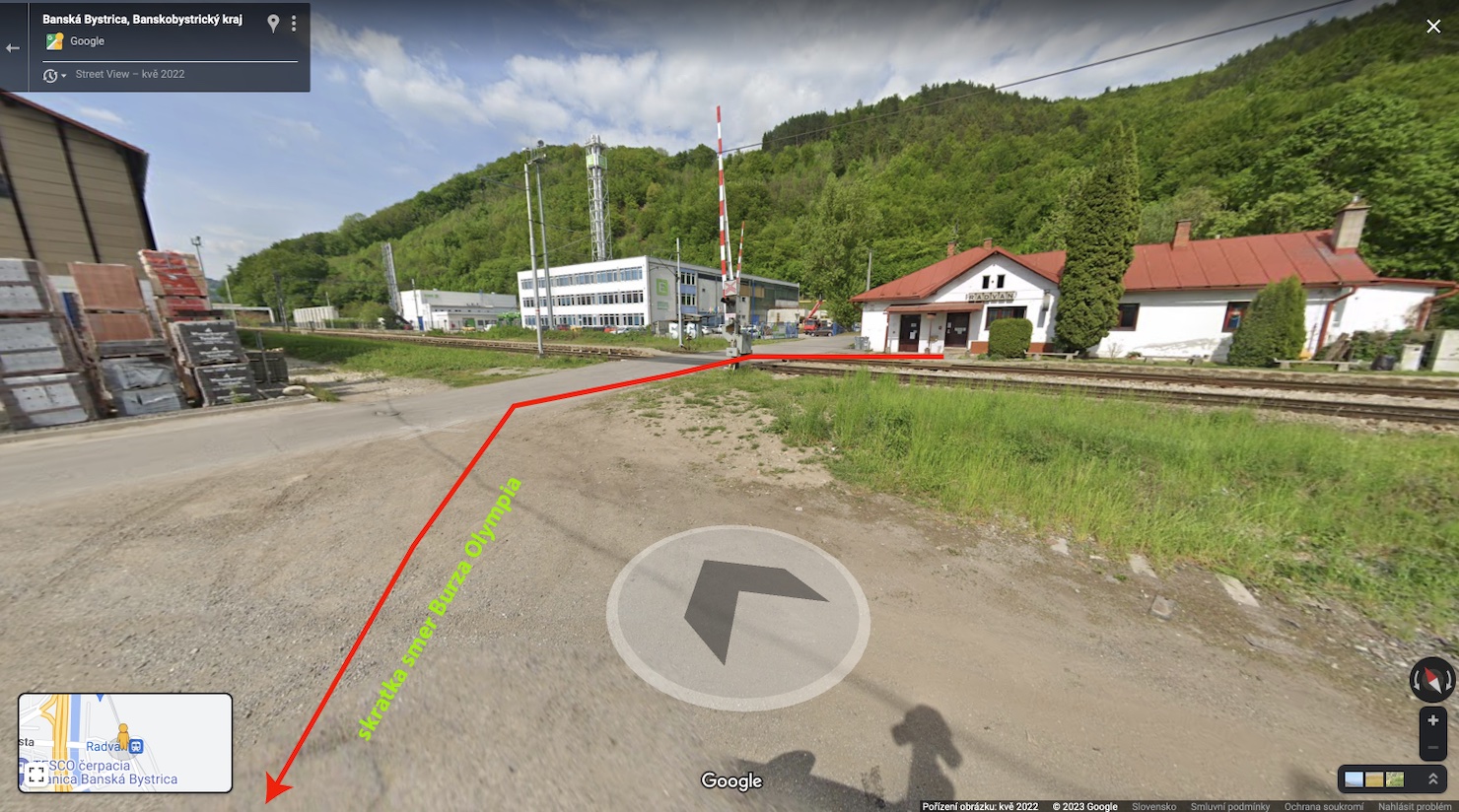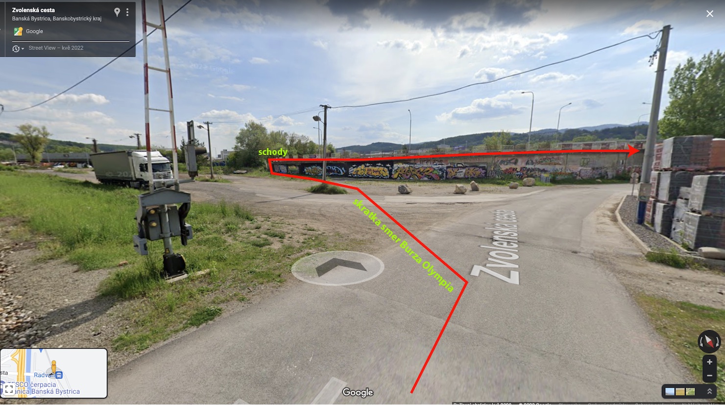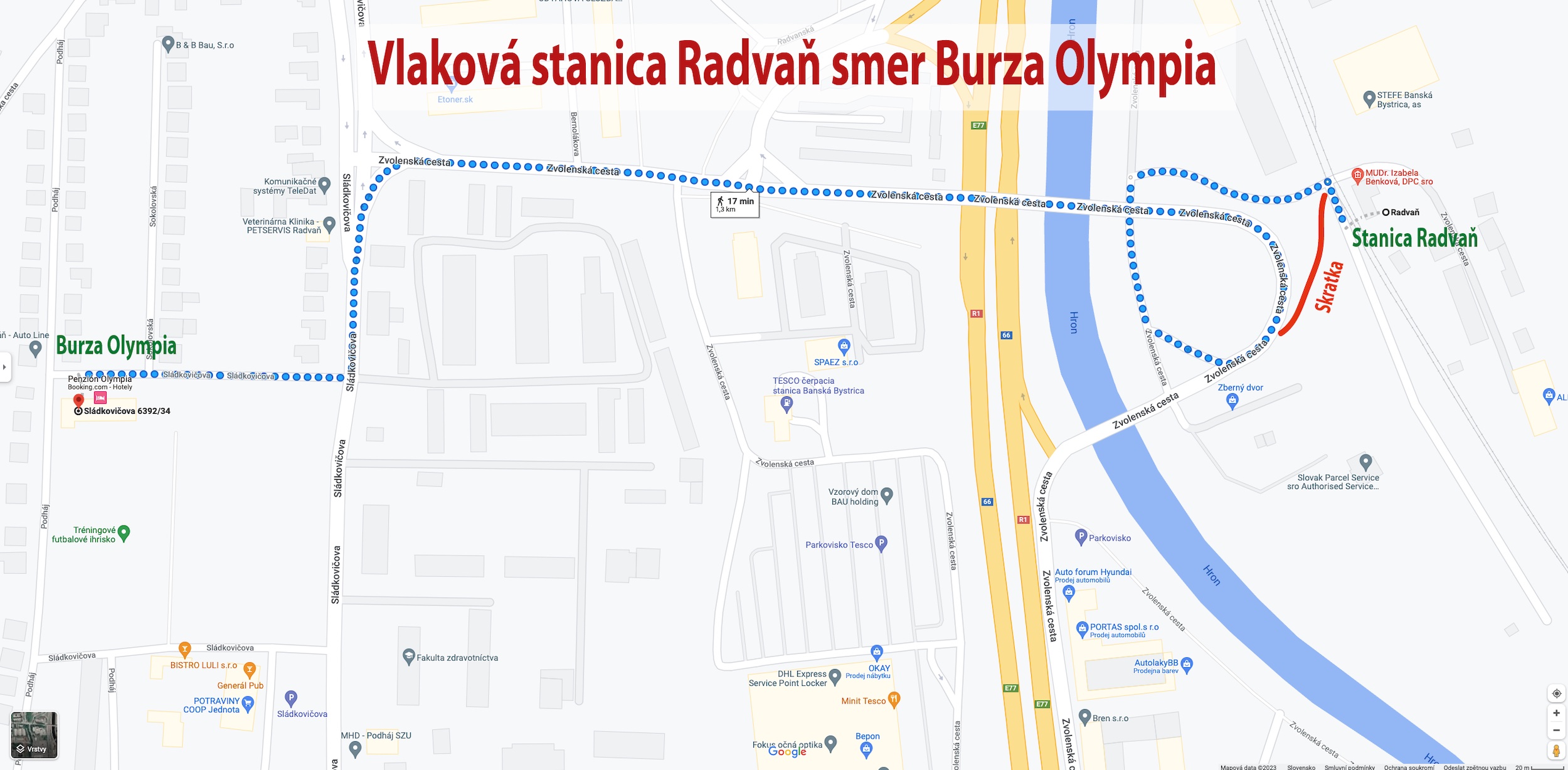 Stručná mapka ako sa dostať zo železničnej stanice Radvaň na burzu do penziónu Olympia. Červená cesta je skratka ku schodom aby si nemusel obchádzať dookola popod most.