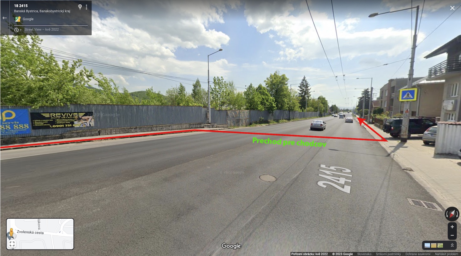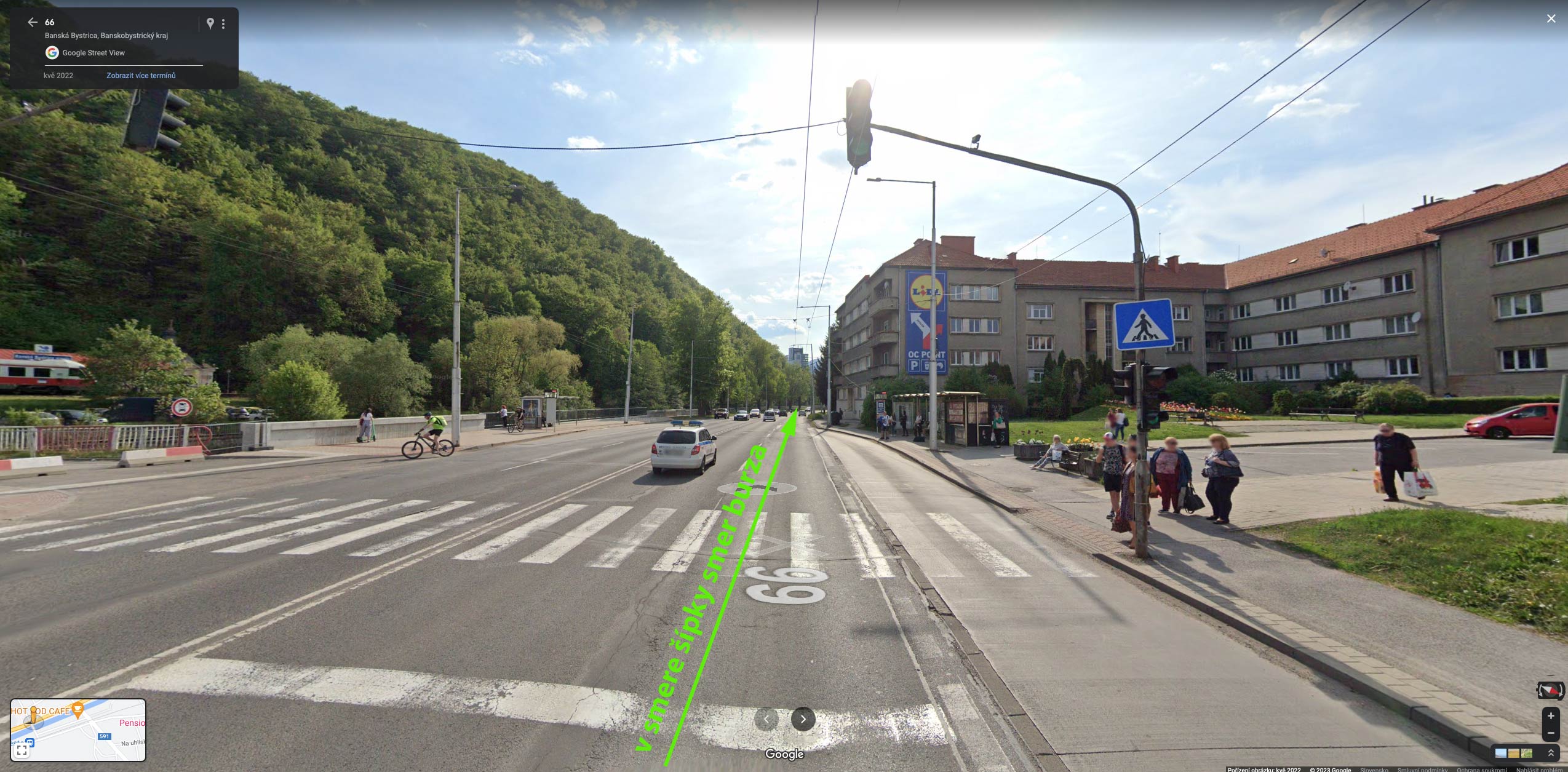 Hore schodmi a následne po chodníku do hora v smere šípky stále rovno ku križovatke. Pred križovatkou prejdeš na druhú stranu a stalé rovno hore cez prechod popri semafafóre cez autobusovú zástavku.