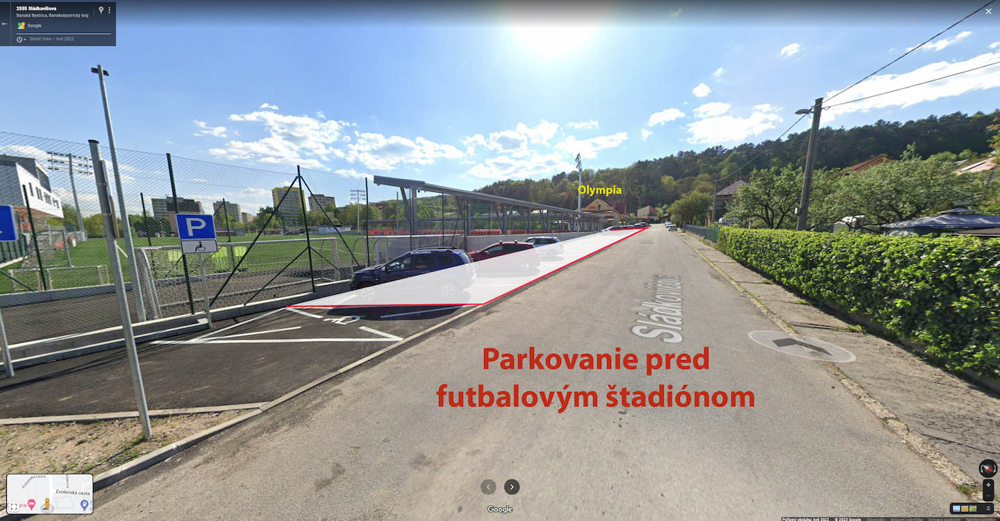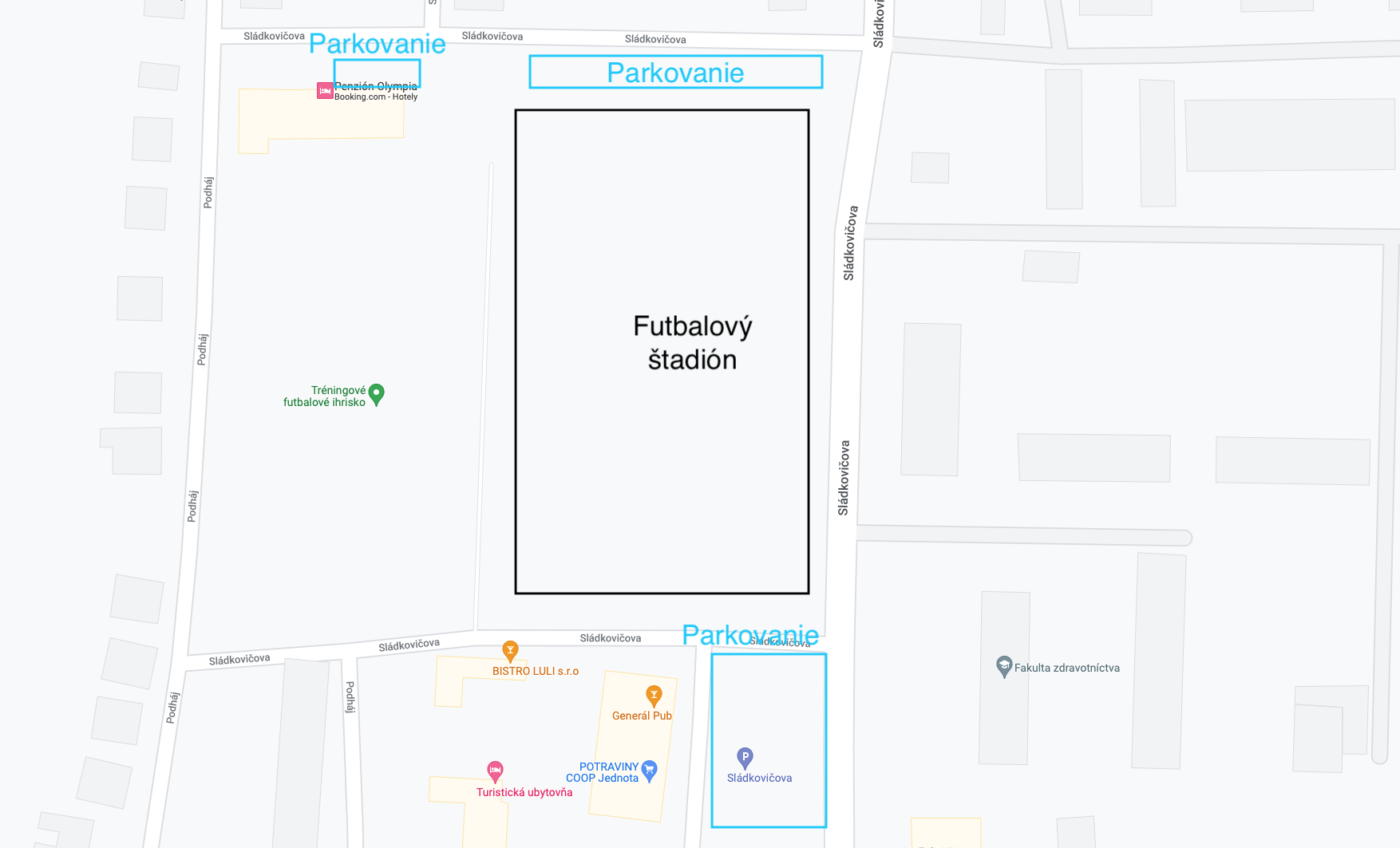 Parkovanie je zabezpečené priamo pred penziónom Olympia a tiež poniže penziónu pred futbalovým štadiónom. V prípade obsadenosti parkovacích miest pred Olympiou a štadionóm je možné zaparkovať na parkovisku o ulicu vedľa na Sládkovičova 36. Pred potravinami COOP Jednota, kde sa nachádza verejné parkovisko viď mapka nižšie. Na obrázku pod mapkou sú modrým obdĺžnikom vyznačené miesta, kde sa dá parkovať.