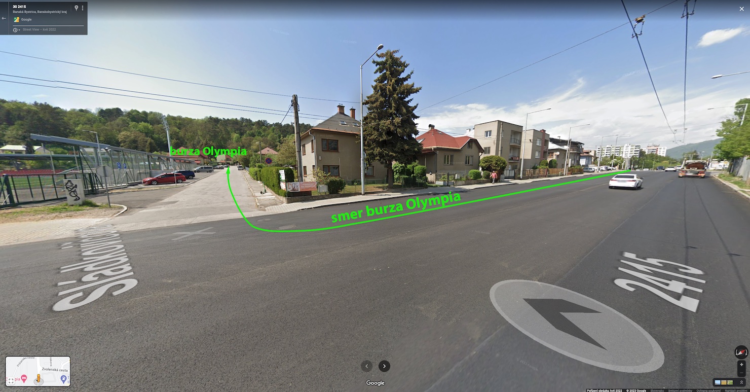 V prípade, že ideš smerom od Bratislavy po diaľnici ťa navigácia bude pravdepodobne chcieť navigovať až k nákupnému stredisku ESC Európa a pod mostom na svetelnej križovatke ťa zvrtne doľava a budeš sa vracať mimo diaľnice naspäť. Odporúčam však použiť prvý výjazd z diaľnice pred vstupom do BB. Asi po 400 metroch za čerpacou stanicou OMV sa nachádza vpravo socha. Za ňou je výjazd na starú Zvolenskú cestu. Výjazd ťa dovedie na križovatku a tu treba dať pozor pri odbočovaní, si na vedľajšej ceste. Odbočíš vľavo a pokračuješ rovno v smere na BB. Pri prvej križovatke za ceduľou BB odbočíš doprava a pokračuješ po 20 metroch ľavotočivou ostrou zákrutou na most ponad diaľnicu. Stále rovno. Na konci prídeš na križovatku T a odbočíš vpravo. Tu pokračuješ stále rovno cca 1,5 km míňajúc po pravej strane pivovar Urpín, BouncePark a čerpaciu stanicu Slovnaft až k futbalovému štadiónu. Pri pumpe Slovnaft sa môžeš preradiť do ľavého pruhu. Za futbalovým štadiónom odbočíš doľava a popri parkovacích miestach smerom hore rovno až k penziónu Olympia. Vitaj ! Si tu.