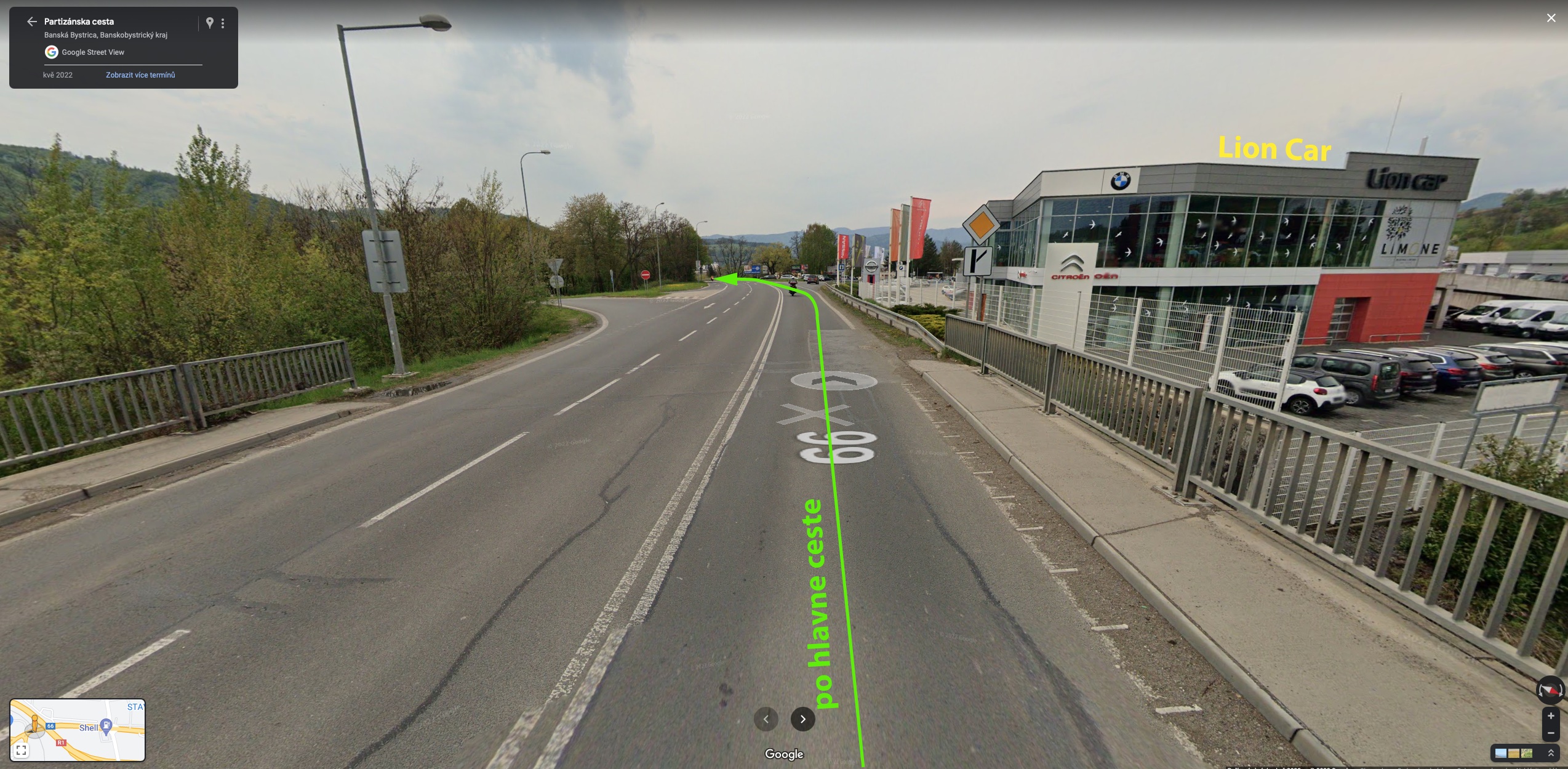 Pri predajni áut LION CAR pokračuj po hlavnej ceste v mierne ľavotočivej zákruty