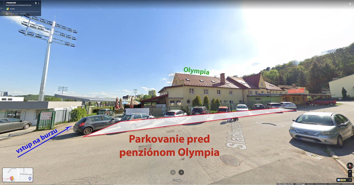 Pri vjazde do BB, kde začína obchvat a z jednoprúdovej cesty sa stáva dvojprúdova pokračuješ rovno. Celý čas pokračuješ rovno po obchvate bez odbáčania. Keď sa priblížiš k McDonaldu, ktorý budeš míňať po pravej strane tak spozornieš. O chvíľu budeš odbáčať. Navigácia ťa pravdepodobne bude navigovať aby si šiel hneď na prvej odbočke za McDonaldom z obchvatu dole do prava ale ty budeš pokračovať rovno a zídeš z obchvatu až na druhej možnej odbočke do prava pri Tescu. Ak by si šiel dole na prvej, je šanca že sa z jednej križovatky už tak skoro nepohneš. Po zídení z obchvatu zabáčaš do pravej strany a pokračuje rovno. Po ľavej stane budeš míňať benzínovú pumpu Slovnaft a po pravej bočnú stranu Tesca. Stúpať budeš miernym kopčekom a pri ďalšej pumpe Slovnaft na ľavej strane odbočíš na križovatke do pripájacého pruhu do prava. Pokračuješ rovno a preradíš sa do vnútorného pruhu čiže ľavého. Prejdeš cez semafór, na ľavej strane sa bude nachádzať futbalový štadión. Na jeho konci je možnosť odbočenia do ľava. Odbočíš do ľava a pokračujes cca 200 metrov rovno. Tu sa už bude nachádzať penzión Olympia. Zaparkuješ a peši prejdeš do brány a následne cez vonkajšiu terasu do dverí. Vitaj ! Si tu.